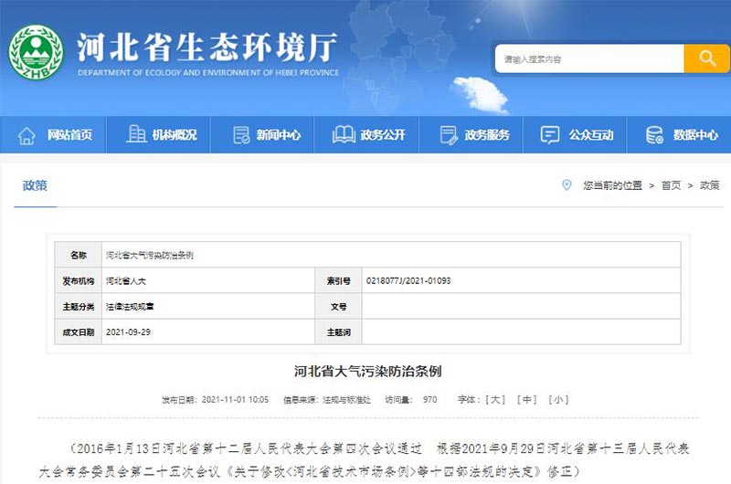 近日,河北省印發了《河北省大氣污染防治條例》修正版,該《條例》共計93條,8章。